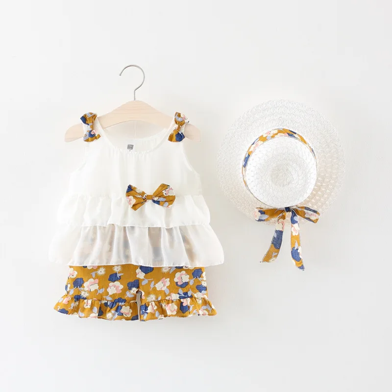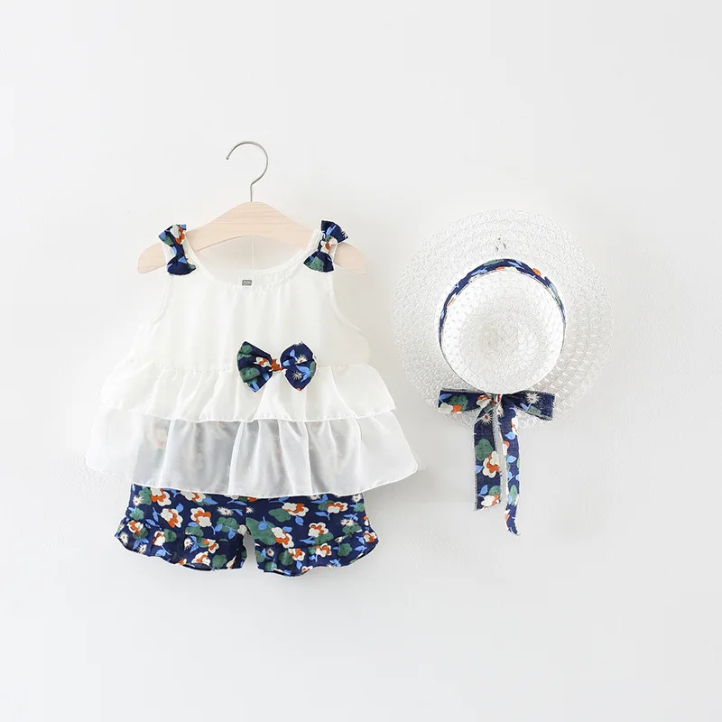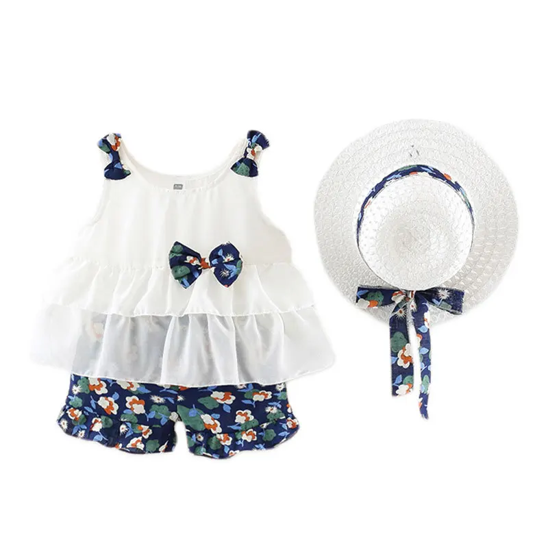 Hot Sale 2019 Summer Newborn Baby Girl Clothes Strap Bow Vest + Floral Shorts + Fashion Hat 3Pcs Set Baby Cl