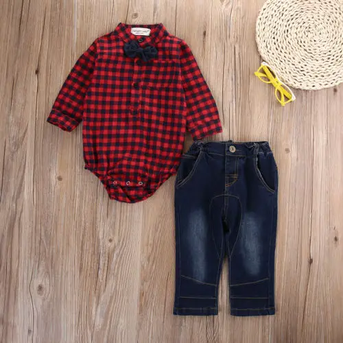 Fashion New Spring&Autumn Baby Boy Clothing Set Gentlement Plaid Shirt + Jeans boy Tracksuit set Ge