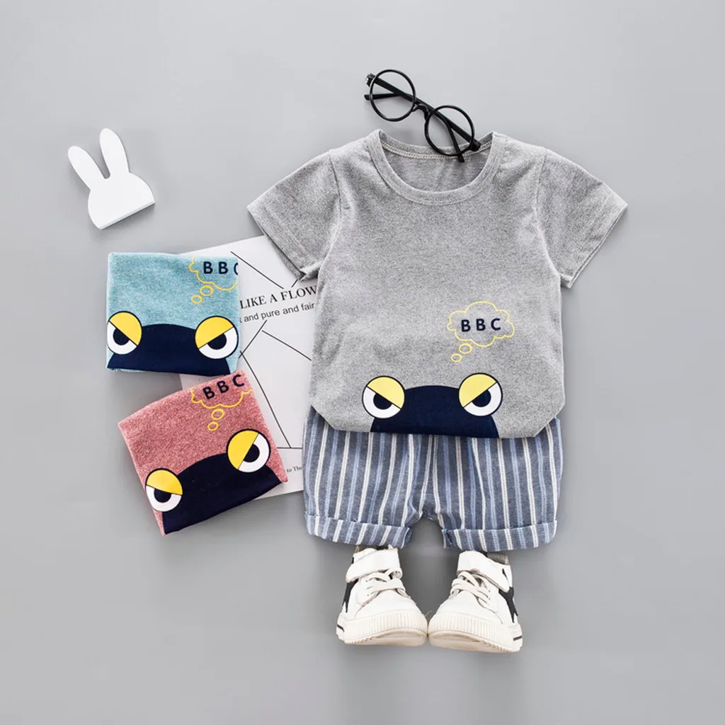 Infant Boys Girls Clothes Set Short Sleeve Cartoon Print Tops + Stripe Short Outfit Newborn Baby Se