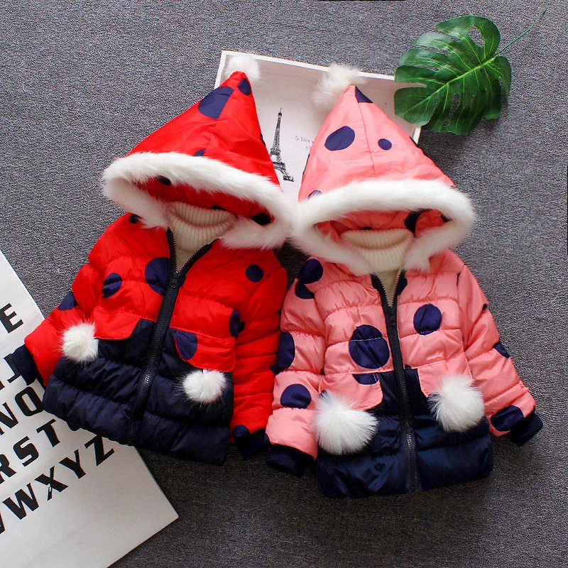 Winter baby Girls'Furry and Thickened Cotton Dot Warm Garments Cotton Printing Hooded Long Outerwea